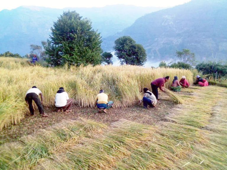 म्याग्दीको बेनी नगरपालिका–१ रत्नेचौरमा धान भित्र्याउनको लागि खेतमा धान काट्दै किसान । गाउँका युवाहर रोजगारका लागी विदेशगएपछि यतिबेला कृषकहरुलाई जनशक्तिको अभावमा धान बाली भित्र्याउन कठिन परेको किसान बताउछन् । तस्वीर : कमल खत्री