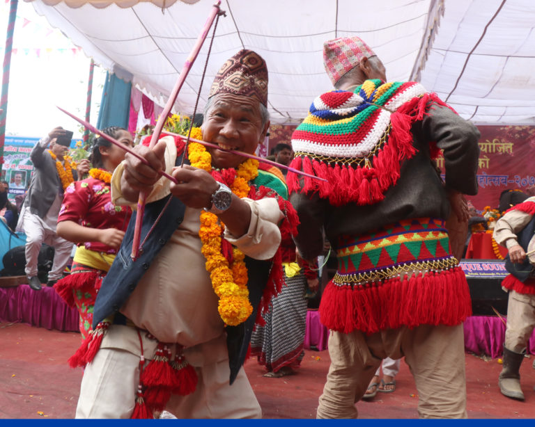 ओखलढुुङ्गामा पोकली झरना सेवा समाजद्वारा आयोजित सांस्कृतिक पर्यटन महोत्सवमा धनुुष खेल देखाउँदै स्थानीयवासी । तस्वीर : चन्द्रकला क्षेत्री