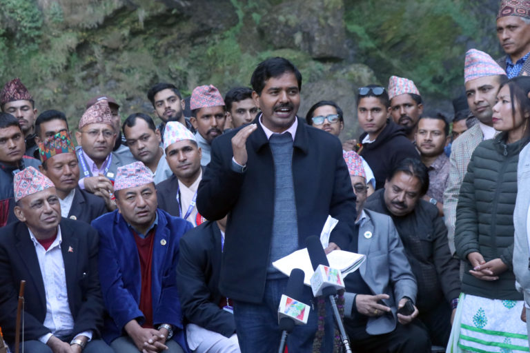 पर्यटन वर्ष २०२० को एकसय गन्तव्यभित्र परेको ओखलढुुङगाको पोकली झरनाको परिसरमा लोकदोहोरी प्रस्तुत गर्दै सञ्चारकर्मी तथा कलाकार कृष्ण कँडेल । तस्वीर : चन्द्रकला क्षेत्री