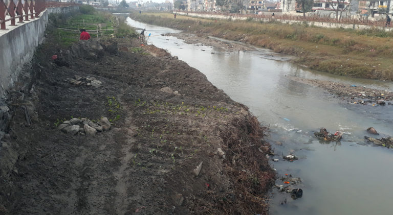 एशियाली विकास बैंक (एडिबी) को ऋण सहयोगमा शुरु भएको वागमती सौन्दर्यीकरणको काम अलपत्र भएसँगै दक्षिणढोका–गोकर्ण र गुह्येश्वरी–नारायणटार खण्डको नदी किनार अतिक्रमण गरी तरकारी खेती शुरु भएको छ । यसतर्फ सरोकारवालाले ध्यान नदिएको स्थानीयवासीको गुनासो छ । तस्बिरः पूर्णप्रसाद मिश्र