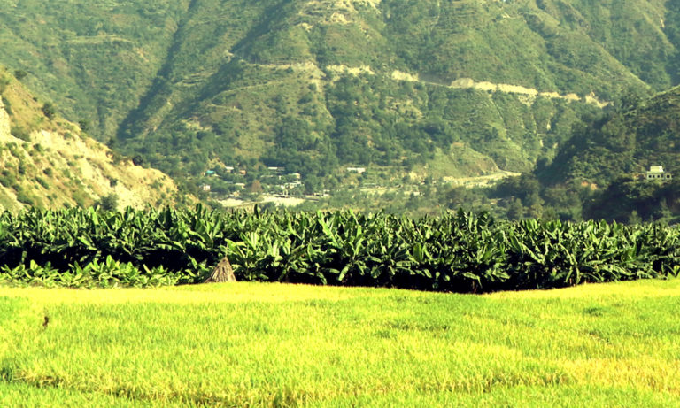 काभे्र जिल्ला नेपालटारको खेतमा लगाएको धानबाली र केराको व्यवसायिक खेती । तस्वीर : चन्द्रकला क्षेत्री