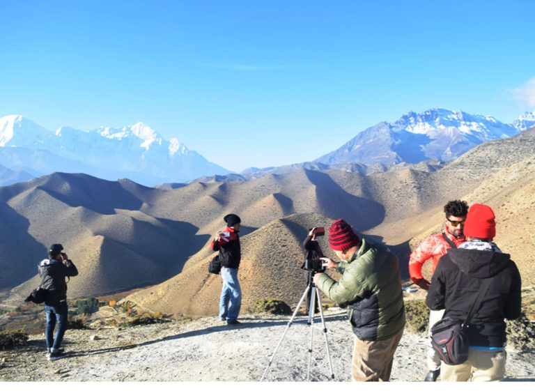 मुस्ताङको हिमाली उजाड मरुभूमिमा रमाउँदै गरेका पर्यटक । मुस्ताङको माथिल्लो क्षेत्रमा रहेको हिमाली मरुभूमि पर्यटकको आकर्षणको केन्द्र बनेको छ । तस्वीर : कमल खत्री