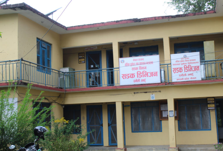 सडक डिभिजन कार्यालय दमौलीमा राखिएको दुई बोर्ड । सङ्घ र प्रदेश दुवै सरकारले आआफ्नो दाबी गर्दै कार्यालयमा छुट्टाछुट्टै बोर्ड राखेका हुन् । सङ्घ वा प्रदेश कुन मातहतमा रहने भन्ने विवादसँगै दुवैतर्पmबाट बजेट विनियोजन नहुँदा विकास निर्माणका काम प्रभावित बनेको छ । तस्बीर : सानेबहादुर नेपाली/रासस
