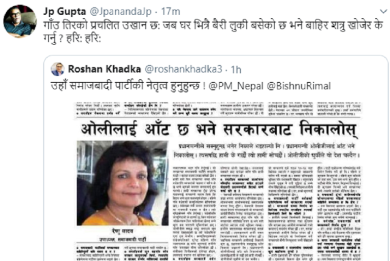 रेणु यादवले उपेन्द्र यादवलाई अप्ठ्यारो पर्ने गरी अन्तवार्ता दिएपछि कुनैपनि एउटै दलमा रहेका जयप्रकाश गुप्ताले व्यङ्ग्य गरेका छन् । उनले लेखेका छन्, ‘गाउँ तिरको प्रचलित उखान छ जब घर भित्रै बैरी लुकी बसेको छ भने बाहिर शत्रु खोजेर के गर्नु ।’ जेपीले रेणु उपेन्द्रको शत्रु बनिसकेको आशयसहित ट्वीटर गरेका हुन् । Photo Source: Twitter