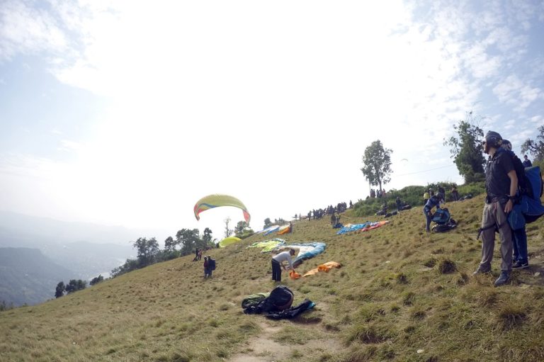 पोखरा, २३ कात्तिकः पर्यटकीय नगरी पोखराबाट सूर्योदय र हिमाली दृश्यावलोकन गर्ने उपयुक्तस्थल सराङ्गकोटबाट प्याराग्लाइडिङ गर्दै पर्यटक ।