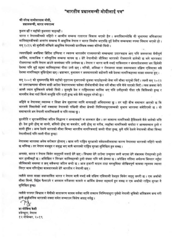 काठमाडौं, कार्तिक २७ । चिकित्सा शिक्षाका अभियन्ता डा गोविन्द केसीले भारतीय प्रधानमन्त्री नरेन्द्र मोदीलाई चिठी लेख्दै अनशन स्थगित गरेका छन् । सीमा विवादको विषयलाई समेटेर डा केसीले भारतीय प्रम मोदीलाई चिठी लेखेको चिठीको पूर्णपाठ ।