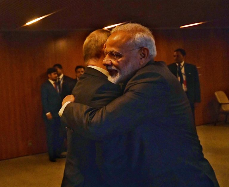 भारतीय प्रधानमन्त्री नरेन्द्र मोदीले रुसी राष्ट्रपति भ्लादिमिर पुटिनसँग अंकमाल गरेका छन् । ब्रिक शिखर सम्मेलनमा सहभागी हुन ब्राजिल पुगेका उनले पुटिनसँगको भेटमा बिहिबार अंकमाल गरेका हुन् ।