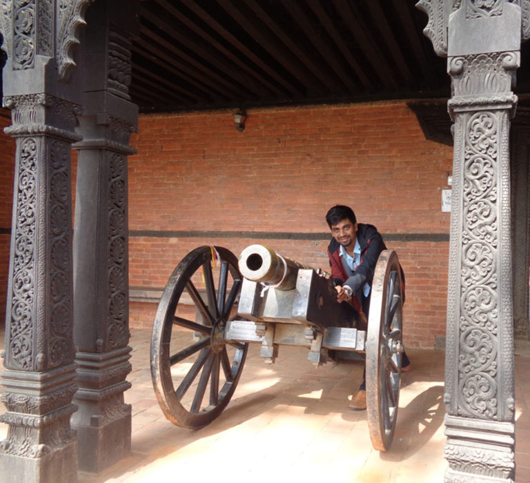 गोरखास्थित गोखरा संग्रहालयको मुख्य प्रवेशद्वारमा राखिएको सन् १७९२ मा निर्मित तोपसँगै बसेर फोटो खिचाउँदै आन्तरिक पर्यटक ।