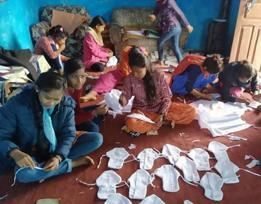 डोटी,४ मङ्सिर (रासस) : डोटीको शिखर नगरपालिका १ कपल्लेस्थित केदारेश्वर माध्यमिक विद्यालयका छात्रा सेनेटरी प्याड बनाउने तालिम लिँदै । तस्वीर : विमलबहादुर विष्ट