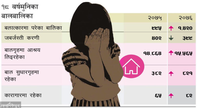 बालबालिकाहरू अपराध र आपराधिक घटनामा प्रयोग हुने र बालबिझ्याइँ ९अपराध० का घटनामा वृद्धि भएको समेत प्रतिवेदनले देखाएको छ । अघिल्लो आर्थिक वर्षमा ८ बाल सुधारगृहमा ३ सय ८२ बालबालिका संरक्षणमा रहेका थिए भने यो वर्ष त्यो संख्या ८ सय २१ पुगेको छ ।