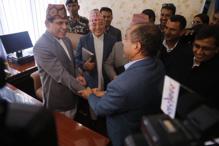 बिहीबार राष्ट्रपति विद्यादेवी भण्डारीसमक्ष पद तथा गोपयिनताको शपथ लिएलगत्तै पदभार सम्हाल्न मन्त्रालय पुगेका नवनियुक्त मन्त्री भुषाललाई निवर्तमान मन्त्री खनाले बधाई दिएका हुन् । तस्बिरः रोशन सापकोटा/रासस