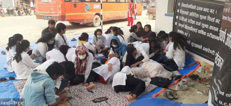 भैरहवास्थित युनिभर्सल कलेज अफ मेडिकल साइन्सेजका विद्यार्थी तीन सातादेखि आन्दोलनमा छन् । कलेजले अवैध रूपमा असुलेको बढी शुल्क फिर्ता गर्न सरकारले दिएको निर्देशन पालना गर्न माग गर्दै उनीहरूले बिहीबार पनि प्रदर्शन गरे । कलेजले शुल्क फिर्ता गरेको छैन । समस्या समाधानका लागि विद्यार्थीसित पहल पनि गरेको छैन । गत असोज ६ मा यस्तो शुल्क फिर्ता गर्न सरकारले एकमहिने अल्टिमेटम दिएको थियो ।