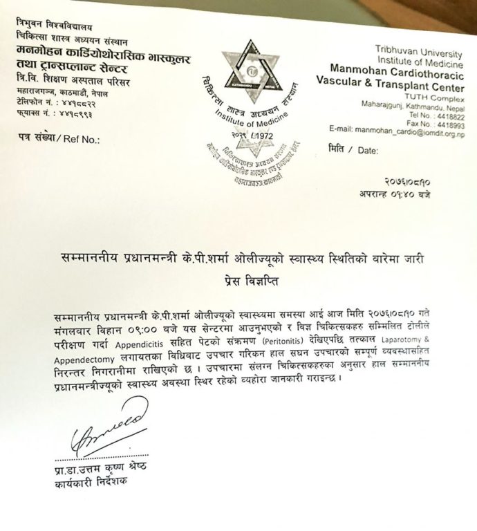 ‘शल्यक्रिया सफल भएको छ,’ उनले भने, ‘सानो शल्यक्रिया हो। अब स्वास्थ्यका अरु विवरण हेरेर अस्पतालमा कति समय बस्ने भन्ने निर्धारण हुन्छ।’ ओलीको एपेन्डिसाइटिसको अपरेसन १२ः४५ बजे सफलतापूर्वक सम्पन्न भएको प्रेस सल्लाहकार सूर्य थापाले बताएका छन् । उपचारमा संलग्न चिकित्सकहरुको अनुसार प्रधानमन्त्रीको पछिल्लो स्वास्थ्य अवस्था स्थिर रहेको छ ।