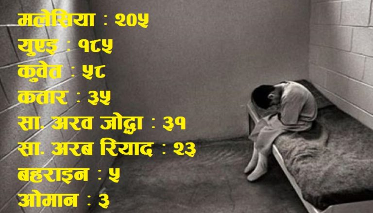 बोर्डकाअनुसार सबैभन्दा बढी मलेसियाको जेलमा २०५ जना नेपाली जेलमा छन् । त्यसैगरी युएइमा १ सय ८५ जना नेपाली जेलमा छन् । कुवेतमा ५८ जना, कतारमा ३५ जना, साउदी अरव जोद्धामा ३१ र साउदी अरबमा रियादमा २३ जना रहेका छन् । त्यसैगरी बहराइनमा ५ र ओमानमा ३ जना नेपाली जेल जिवन विताइरहेका छन् ।