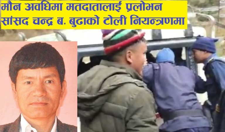 तर ख को चुनावमा नेकपाको समर्थक उम्मेदवार शाहीलाई जिताउनका लागि क प्रदेश सांसद चन्द्र बहादुर बुढा मतदातालाई प्रलोभनमा पार्न पुगेका हुन् । मौन अवधिमा चुनावी प्रचार गर्न नपाइने भए पनि बुढा एक टोलि नै लिएर गाडीमा तमानखोला गाउपालिका–१ बोङ्गादोभान पुगेका थिए ।