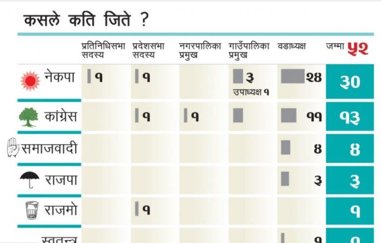 ५२ स्थानमध्ये सत्तारूढ दल नेकपा नेतृत्वको वाम गठबन्धनले ३१ स्थानमा जित हात पारेको छ। कांग्रेसले १३, समाजवादी पार्टीले ४, राष्ट्रिय जनता पार्टीले ३ र स्वतन्त्रले १ स्थानमा जितेका छन्। संसद्मा रहेका चार राष्ट्रिय पार्टी र राष्ट्रिय जनमोर्चाले मात्रै उपनिर्वाचनमा आफ्नो अस्तित्व देखाउन सकेका छन्। चुनावी चर्चामा विवेकशील, साझा, राप्रपा, नेमकिपालगायतका दल रहे पनि उनीहरूले जित निकाल्न सकेनन्। न्यून मतमै उनीहरूले चित्त बुझाउनुपरेको छ। प्रतिनिधिसभाको १, प्रदेशसभाको ३ र स्थानीय तहका रिक्त ४८ स्थानका लागि उपचुनाव भएको थियो। नेकपाले केही स्थानमा आफ्नो पकड गुमाएको छ भने केही स्थान थपेको छ। यसअघि नेकपाले जितेको प्रदेशसभाको भक्तपुर १९क० र धरान उपमहानगरपालिकाको प्रमुख पद उसले गुमाएको छ। प्रतिनिधिसभाको कास्की–२ र दाङ ३९ख० मा नेकपाका विद्या भट्टराई र विमलाकुमारी खत्री विजयी भएका छन्। उक्त दुवै क्षेत्रबाट यसअघि पनि नेकपाकै उम्मेदवारले जितेका थिए। प्रदेशसभाकै बागलुङ २९ख० बाट नेकपाले समर्थन गरेका राष्ट्रिय जनमोर्चाका उम्मेदवार खिमविक्रम शाहीले जितेका छन्। यसअघि पनि उक्त क्षेत्रमा जनमोर्चाले नै जितेको थियो।