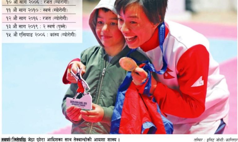 काठमाडौँ, १७ मंसिर । तेक्वन्दोमा नौ वर्षअघि ग्योरोगी फाइट तर्फ स्वर्ण जितेकी आयशा शाक्य १३ औं सागमा पुम्सेको व्यक्तिगत स्पर्धा स्वर्ण जितेपछि सोमबार एरिनाबाट बाहिरिँदा पति दीपक विष्ट र जेठा छोरा आदिशलाई अँगालो मार्दै धेरैबेर रोइन् । उनलाई सम्हालिन निकै गाह्रो भएको थियो । एउटा खेलाडीको रुपमा मात्रै होइन, एउटी आमाको रूपमा पाएको सफलतामा झरेको आँसु खुसीकै थियो ।