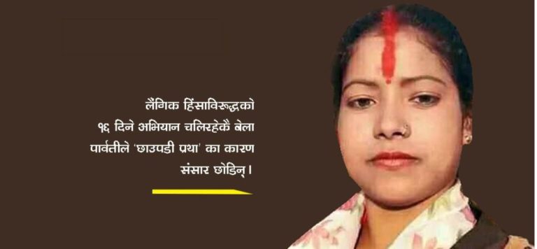 काठमाडौँ, १७ मंसिर । विस्तारै बोल्ने । सधैं हाँसिरहने । जस्तोसुकै काम पनि मन लगाएर गर्ने । केटाकेटीलाई माया गर्ने । साँफेबगर नगरपालिका–३ सिद्धेश्वरकी २१ वर्षीया पार्वती बुढा रावतको स्वभाव कसैलाई नबिझाउने थियो । उनी घरपरिवार मात्र होइन, समाजकै प्यारी थिइन् । लैंगिक हिंसाविरुद्धको १६ दिने अभियान चलिरहेकै बेला उनै पार्वतीले ‘छाउपडी प्रथा’ का कारण संसार छोडिन् । महिनावारीको चौथो दिन सोमबार बिहान छाउगोठमै मृत अवस्थामा भेटिइन् ।