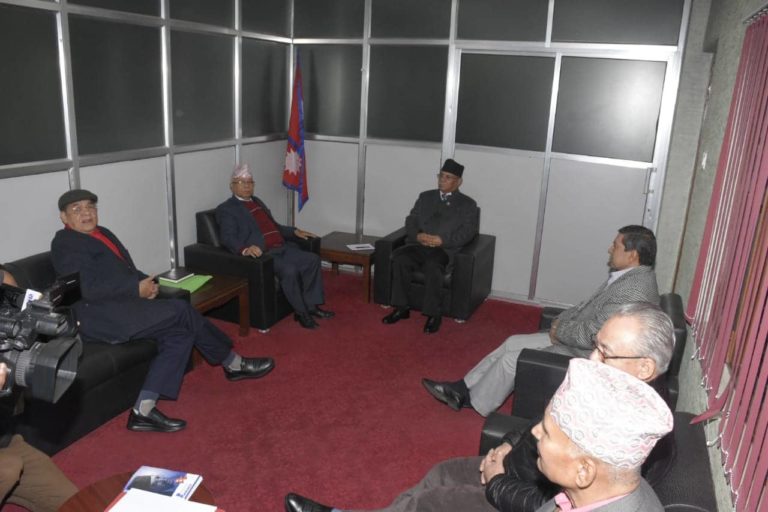 प्रचण्डले पार्टी बैठक डाक्नुअघि अर्का अध्यक्ष ओलीलाई भेटेर जानकारी गराएका थिए । उनले बैठकमा गर्ने छलफलबारे समेत परामर्श गरेका थिए । Photo: Mukunda Kalikote
