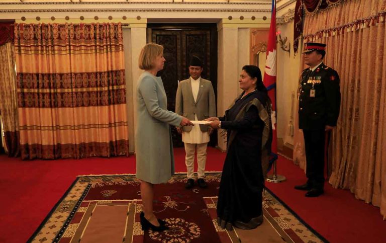 काठमाडौं, १९ मंसिर । सबैभन्दा पुरानो मित्र मुलुक बेलायतले पहिलोपटक नेपालमा महिला राजदूत पठाएको छ। नवनियुक्त बेलायती राजदूत निकोला कथ्राइन पोलिटले बुधबार राष्ट्रपति विद्यादेवी भण्डारीसमक्ष ओहोदको प्रमाणपत्र बुझाएकी हुन्।