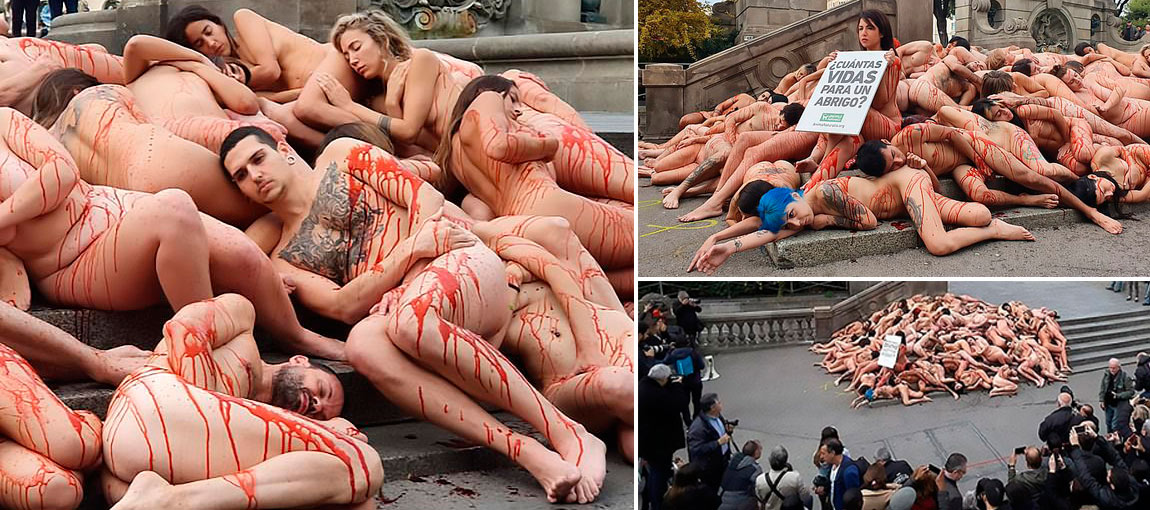 यो दिवस मनाउने क्रममा पशुपंक्षीलाई काटमार गर्ने कामको विरोध गर्दै ७० जना अभियन्ताहरु नांगै सहरमा सुते । नांगो शरीरमा नक्कली रगत पोखेर उनीहरुले बार्सिलोना सहरमा विरोध जनाएका हुन् । डेलीमेलका अनुसार ब्ल्याक फ्राइडेु को रुपमा क्याटालोनिया स्क्वायरमा उनीहरुले विरोध प्रदर्शन गरेका थिए । जुन भिडियो फूटेज अहिले सामाजिक सञ्जालमा पनि व्यापक शेयरु गरिएको छ । हरेक वर्ष हजारौं पशुपंक्षीको हत्या तथा दुव्र्यवहारलाई रोक्नुपर्ने उनीहरुको माग छ । यस्तो अनौठो विरोध प्रदर्शनको कार्यक्रम पशु अधिकार संस्था अनिमा नेचुरलीसुको आयोजनामा भएको थियो ।