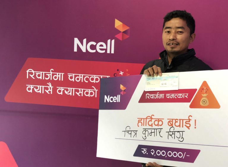 योजनाको पहिलो हप्ताका पाँच विजेता ग्राहकहरु मध्ये बिहीबार एक ग्राहक सिगुलाई एनसेल सेन्टर कुमारीपाटीबाट रु २ लाख नगद पुरस्कार ग्रहण गरेका छन् । पेशाले सिकर्मी रहेका सिगुले नगद पुरस्कार पाएर अत्यन्त खुसी व्यक्त गर्दै आफुले पाएको पुरस्कार रकमले आफ्नो बगुंर फार्ममा थप लगानी गर्ने बताए ।