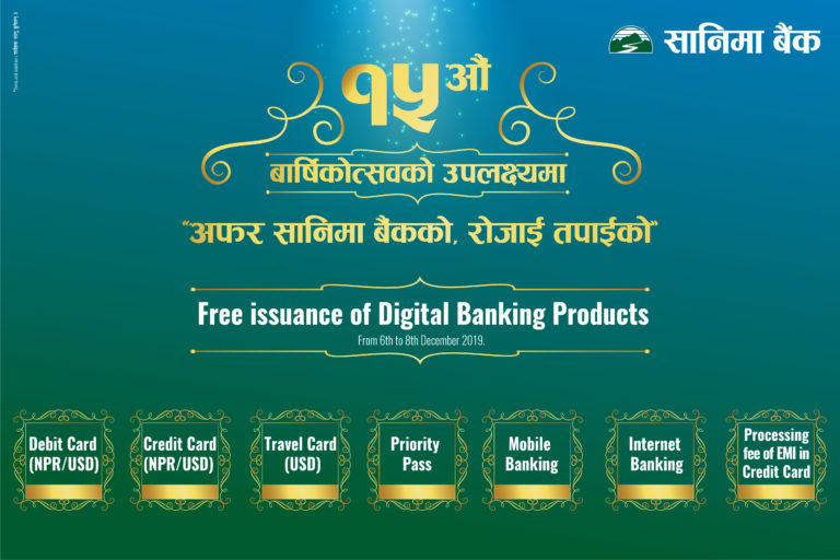 काठमाडौं, २० मंसिर । सानिमा बैंक लिमिटेडले आफनो १५औं बार्षिकोत्सवको उपलक्ष्यमा आफ्ना ग्राहकहरुलाई “अफर सानिमा बैंकको, रोजाई तपाईको” नामक योजना ल्याएको छ । यस योजनामा सानिमा बैंकको विभिन्न डिजिटल सेवाहरु तथा सामान खरिदमा छुट प्रदान गर्नेछ ।