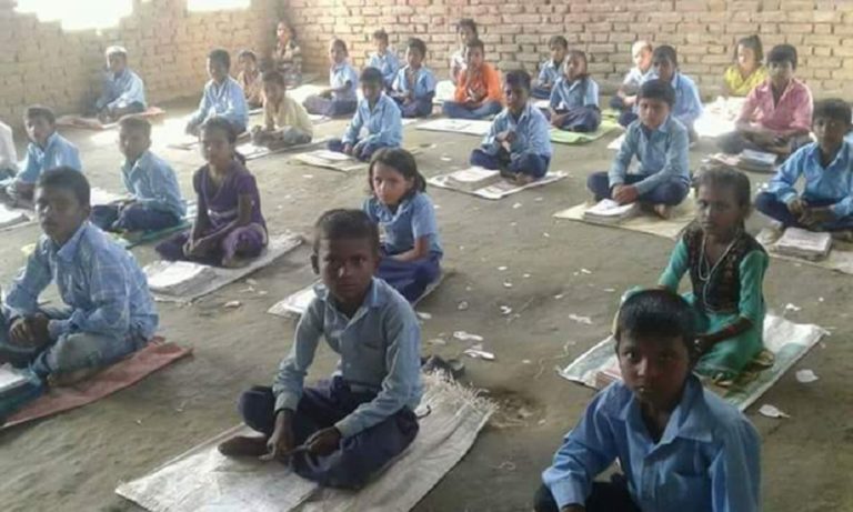 बोरा ओछ्याएर पढ्दै गौशाला नगरपालिकाका विद्यार्थी