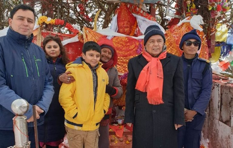 ताप्लेजुङ, २९ मङ्सिर : ताप्लेजुङमा अवस्थित प्रसिद्ध तीर्थस्थल पाथीभरा मन्दिरको दर्शनका लागि आइतबार बिहान परिवारसहित मन्दिर पुगेका नेपाली काङ्ग्रेसका वरिष्ठ नेता रामचन्द्र पौडेल । तस्वीर : सन्तोष पुर्कुटी-रासस