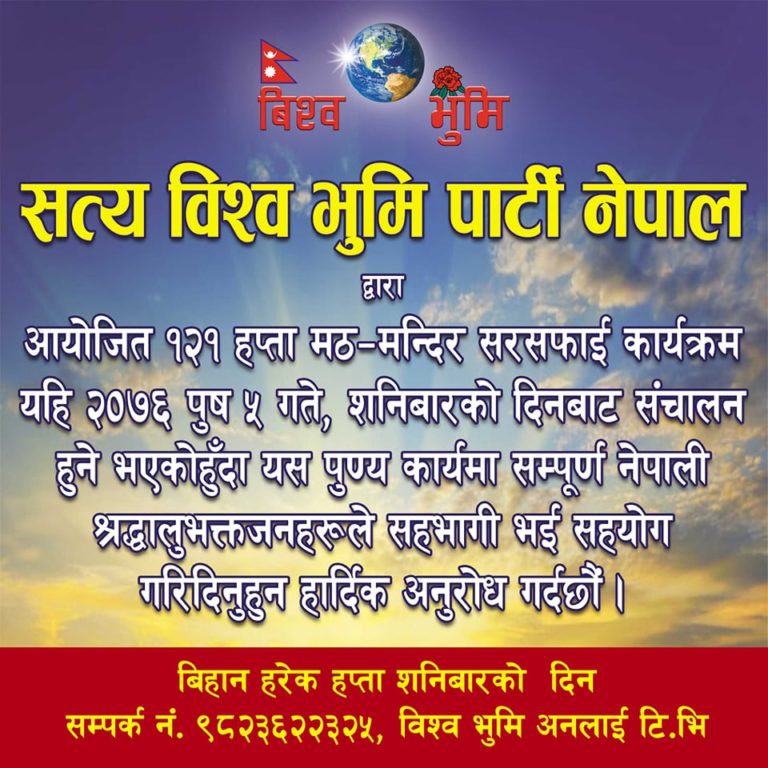 काठमाडौं, ३० मंसिर । नवगठित सत्य विश्व भूमी पार्टी नेपालले आउने पुसको पहिलो हप्ताबाट १ सय २१ हप्तासम्म विभिन्न मठ, मन्दिरको सरसफाई गर्ने घोषणा गरेको छ । पार्टीका अध्यक्ष होम बहादुर कार्की (विश्व भक्त) ले आउने पुषको ५ गतेबाट सरसफाई अभियान सञ्चालन गर्न लागिएको जानकारी दिए ।