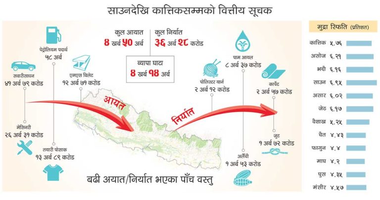 राष्ट्र बैंकका कार्यकारी निर्देशक डा।गुणाकर भट्ट भने सरकारले मंसिरपछि मात्रै पुँजीगत खर्च बढाउने भएकाले चार महिनाकै तथ्यांकका आधारमा आर्थिक वृद्धि खुम्चिने विश्लेष गर्दा चाँडो हुने बताउँछन्। बरु, आयात घट्ने र निर्यात बढ्ने प्रबृत्तिले अन्तरराष्ट्रिय व्यापारलाई लयमा फर्काएको उनको तर्क छ। तर राष्ट्र बैंककै तथ्यांकले भूमध्ये रेखाको वरपर अत्यधिक गर्मीमामात्रै फल्ने पामको तेल प्रशोधन गरेर निर्यात बढाएका कारण पैठारी बढेको देखिएको पुष्टि गर्छ। गत वर्षको तुलनामा यो वर्ष पाम तेलको निर्यात झण्डै १० गुणा बढेको छ। पोहोर मुलुकको कुल निर्यातको ३ प्रतिशतभन्दा कम योगदान गर्ने यस्तो आयातित कच्चापदार्थमा आधारित तेलबाट अहिले हाम्रो अर्थतन्त्रले २३ प्रतिशतभन्दा बढी निर्यात आम्दानी प्राप्त गर्न थालेको छ। एउटै वस्तुको परनिर्भरताका आधारमा बढेको निर्यातले तत्कालका लागि भने आर्थिक सूचकांक सुधार्न सघाउ पुर्याएको छ। व्यापार घाटा झण्डै ९ प्रतिशत घटेर ४ खर्ब १४ अर्बमा खुम्चिनुमा पाम तेलको ठूलो योगदान देखिन्छ। यद्यपि, तयारी पोसाक, गलैंचाजस्ता परम्परागत निर्यात सामग्रीको निर्यात खुम्चिँदा अन्तर्राष्ट्रिय व्यापारमा अझै चुनौती थपिएको छ।