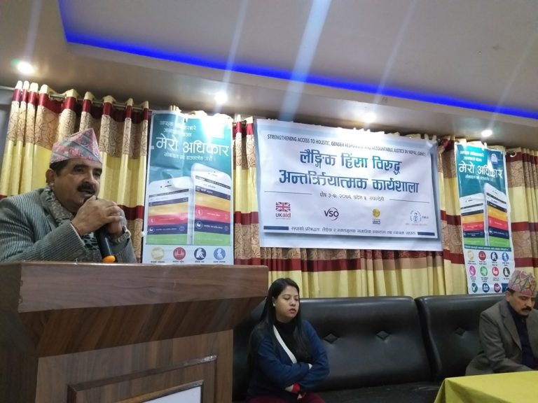 लुम्बिनी, ३ पुस : महिला, कानून र विकास मन्चको आयोजनामा भैरहवामा बिहीबारदेखि सञ्चालित लैङ्गिक हिंसा विरुद्धको ५ दिने कार्यशालालाई सम्बोधन गर्दै जिल्ला अदालत रुपन्देहीका प्रमुख न्यायाधीश धनसिंह महरा ।