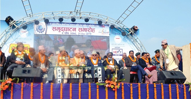 काठमाडौँ, १० पुस। नेपाल भ्रमण वर्ष २०२० लाई लक्षित गरी झापाको मेचीनगर धुलाबारीमा बुधबारदेखि तेस्रो अन्तर्राष्ट्रिय औद्योगिक व्यापार, कृषि तथा पर्यटन महोत्सव सुरु भएको छ । महोत्सवको प्रदेश १ का मुख्यमन्त्री शेरधन राईले विधिवत उद्घाटन गरे। उद्घाटन समारोहलाई भव्य बनाउने क्रममा हेलिकप्टरबाट पुष्पवर्षा गराउनका साथै यस क्षेत्रका विभिन्न जनजातिको झाँकीसमेत प्रस्तुत गरिएको थियो ।