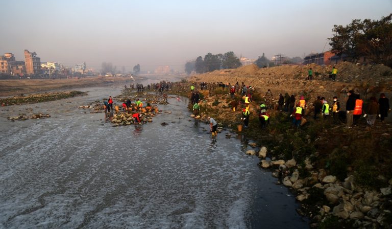 काठमाडौँ, १२ पुसः : ३४६ औँ हप्ताको बागमती सफाइ अभियानमा कुपण्डोलस्थित बागमती नदीमा शनिबार सरसफाइमा सहभागी हुर्दै अभियान्ता ।