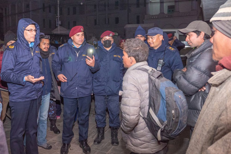 काठमाडौं, पुस १३ । शुक्रबार राति ९ बजे महानगरीय प्रहरी कार्यालयका प्रमुख प्रहरी नायब महानिरीक्षक विश्वराज पोखरेल डीआइजी सहितको टोली सडक अनुगमनमा थियो । टोलीमा काठमाडौं महानगरपालिका, मानवसेवा आश्रम, प्रहरी, पत्रकार र विभिन्न सङ्घसंस्थाका प्रतिनिधिहरु सहभागी थिए ।
