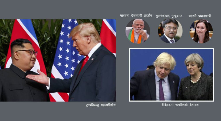 काठमाडौँ, १५ पुस । विश्वमा यस वर्ष भएका विभिन्न घटनाप्रति अन्तर्राष्ट्रिय समुदायको ध्यान केन्द्रित भयो । तीमध्ये केही घटना लामो समयसम्म सञ्चारमाध्यममा छाइरहे । राष्ट्रपति डोनाल्ड ट्रम्पका कारण यस वर्ष अमेरिका नै चर्चाको केन्द्रमा रह्यो । २०१९ सुरु भएसँगै उत्तर कोरियाली नेतासँगको शान्तिवार्ता गरेका ट्रम्पप्रति वर्षको अन्त्यमा लगाइएको महाअभियोग धेरैको चासोको विषय बन्यो । त्यसका साथै अन्य केही विषय अन्तर्राष्ट्रिय क्षेत्रमा चर्चामा रहे ।