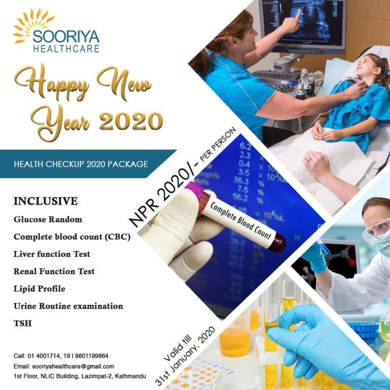 काठमाडौं, १६ पुष । काठमाडौंको मुटु लाजिम्पाटमा अवस्थित् सूरिया डाईगनोष्टिकले अंग्रेजी नयाँ वर्ष २०२० को अवसरमा “हेल्थ चेक अप-२०२०” प्याकेज ल्याएको छ ।