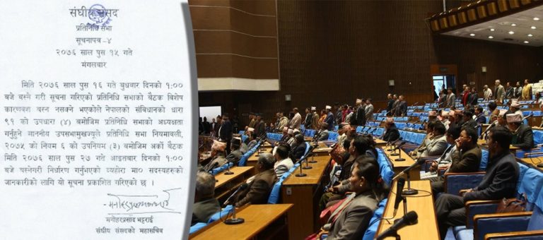संघीय संसद सचिवालयले मंगलबार दिउँसो सूचना टाँस गरी विशेष कारणबस बुधबार बस्ने भनिएको प्रतिनिधिसभाको बैठक पुस २७ गते आइतबार दिउँसो १ः०० बस्ने गरी निर्धारण गरिएको महाचिव मनोहरप्रसाद भट्टराईद्वारा जारी सूचनामा उल्लेख छ ।