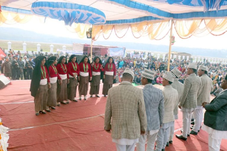 सुर्खेत, १७ पुस : कर्णाली प्रदेश सरकार उद्योग, पर्यटन, वन तथा वातावरण मन्त्रालयद्वारा बुधबार राजधानी सुर्खेतमा आयोजित ‘नेपाल भ्रमण वर्ष सन् २०२०’ को शुभारम्भ कार्यक्रममा कर्णालीको सुप्रसिद्ध साँस्कृतिक नाच देउडा र राउटे नृत्य देखाउँदै जुम्लाका कलाकार ।