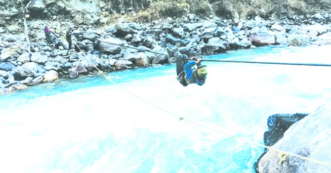 खार्पुनाथ गाउँपालिकाको बोक्चे गौडामा तुइन तरेको एक सय रुपियाँ शुल्क तिरेको यात्रु मनबहादुर फडेराले बताए । कर्णाली करिडोरअन्तर्गत पर्ने खार्पु सुनखाडा खण्डको बोक्चे गौडामा सडक निर्माणका क्रममा बाटो अवरुद्ध भएपछि पैदलयात्रु चर्को शुल्क तिरेर तुइन चढ्न बाध्य छन् । बोक्चे गौडामा असजिलो बाटो पार गर्न कठिन भएपछि स्थानीयले व्यक्तिगत रूपमा निर्माण गरेको तुइन तर्न पैसा तिर्नुपरेको छ ।