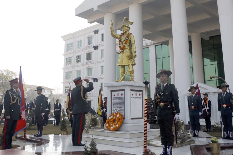 काठमाडौँ, २७ पुस : २९८औँ पृथ्वी जयन्ती तथा राष्ट्रिय एकता दिवसको अवसरमा आइतबार भद्रकालीस्थित नेपाली सेनाको मुख्यालयमा रहेको पृथ्वीनारायण शाहको शालिकमा सलामी अर्पण गर्दै प्रधानसेनापति पूर्णचन्द्र थापा ।