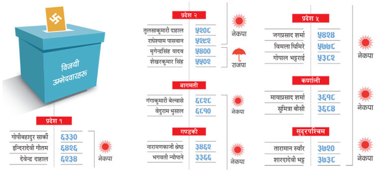 बागमती प्रदेशमा नेकपाबाट महिला समूहतर्फ गंंगाकुमारी बेल्वासे र अन्यतर्फ वेदुराम भुसालले जितेका छन्। गण्डकीमा महिला समूहतर्फ नेकपाकी भगवती न्यौपाने र अन्यतर्फ नेकपाकै नारायणकाजी श्रेष्ठ निर्वाचित भएका छन्। प्रदेश ५ मा नेकपाकै गोपाल भट्टराई, विमला घिमिरे र जगप्रसाद शर्मा निर्वाचित भएका छन्। कर्णालीबाट नेकपाका मायाप्रसाद शर्मा र सुमित्रा बीसी निर्वाचित भएका छन्। सुदूरपश्चिम प्रदेशबाट नेकपाकै उम्मेदवार विजयी भएका छन्। महिला समूहतर्फ शारदादेवी भट्ट र अन्यतर्फ तारामान स्वाँर निर्वाचित भएका हुन्। नयाँ परिणामपछि ५९ सदस्यीय राष्ट्रियसभामा नेकपाका ५० जना (सरकारको सिफारिसमा राष्ट्रपतिबाट मनोनित तीन जनासमेत) सांसद हुनेछन्। आफ्नो १३ सदस्य रहेको प्रमुख विपक्षी कांग्रेस ६ सिटमा खुम्चिने भएको छ। राजपाका दुई र फोरमका एक जना सांसद रहनेछन्। संघीय संसद्को माथिल्लो सदन राष्ट्रियसभामा विपक्षी कांग्रेस नाम मात्रको प्रतिपक्ष बन्ने देखिन्छ। सरकारका कामकारबाहीमा अनुगमन, निर्देशन र नियन्त्रण गर्ने संसद्मा प्रमुख विपक्षीको भूमिका ‘निरीह’ बन्ने देखिन्छ।