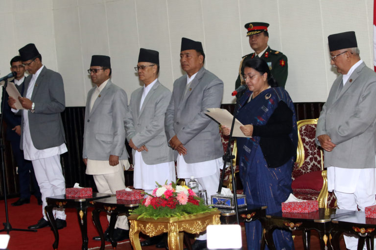 काठमाडौं, १३ माघ । प्रतिनिधिसभाका सभामुखमा नवनिर्वाचित अग्नि प्रसाद सापकोटाले राष्ट्रपति विद्यादेवी भण्डारीबाट पद तथा गोपनीयताको सपथ लिएका छन्। सोमबार राष्ट्रपति कार्यालय शितलनिवासका आयोजित सपथ ग्रहण समारोहमा राष्ट्रपति भण्डारीले सापकोटालाई सपथ खुवाएकी हुन्।