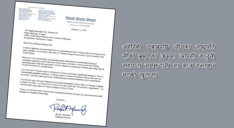 अमेरिकी सिनेटर एवं वैदेशिक मामिला समिति सदस्य रबर्ट मेनेनडेजले अक्टोबर ११ (असोज २४) मा ‘चिनियाँ राष्ट्रपतिको आसन्न नेपाल भ्रमणमा चीनसँग सुपुर्दगी सन्धि गर्न नेपाल तत्पर रहेको र यसबाट नेपालमा रहेका तिब्बती शरणार्थी हटाउने प्रक्रिया अघि बढ्न सक्ने’ भनी पत्रै लेखेर ध्यानाकर्षण गराएका थिए ।