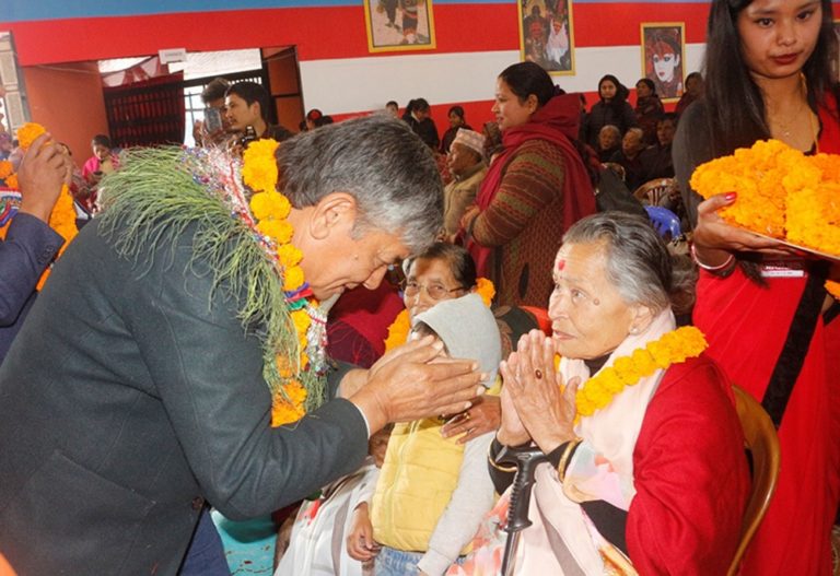 बनेपा, १८ माघः काभ्रेपलाञ्चोकको धुलिखेल नगरपालिका–५ श्रीखण्डपुर युवा समूहले शनिबार आयोजना गरेको जेष्ठ नागरिक सम्मान कार्यक्रममा ज्येष्ठ नागरिकलाई सम्मान गर्दै वरिष्ठ कलाकार मदनकृष्ण श्रेष्ठ ।