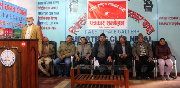 मंगलबार रिपोर्टर्स क्लब नेपालमा पत्रकार सम्मेनलको आयोजना गर्दै उक्त पार्टीले भनेको छ,‘दलको नाममा, सिंगो मुलुक विभाजित छ, राजनीतिको नाममा पनि त्यस्तै विभाजन छ । राष्ट्र, राष्ट्रियता र राष्ट्रिय स्वाभिमानको रक्षा के सबैको साझा स्वार्थ बन्न सक्दैन र ? हो यही प्रश्न खोज्दै आम नेपालीमाझ राष्ट्रियता र सनातन हिन्दू संस्कार एवं संस्कृतिको रक्षार्थ आवाज लिएर पुग्ने उद्देश्यकासाथ यो पार्टी अघि सरेको हो ।’