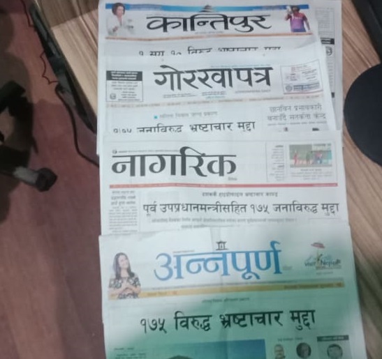 अन्नपूर्ण पोष्ट दैनिकले १७५ विरुद्ध भ्रष्टाचार मुघा भनी मुख्य समाचार छापेको छ । नागरिक दैनिकले दशककै हाइप्रोफाइल भ्रष्टाचार काण्ड भनी समाचार छापेको छ । कान्तिपुर दैनिकले १ सय ५० विरुद्ध भ्रष्टाचार मुद्दा भनी छापेको छ ।