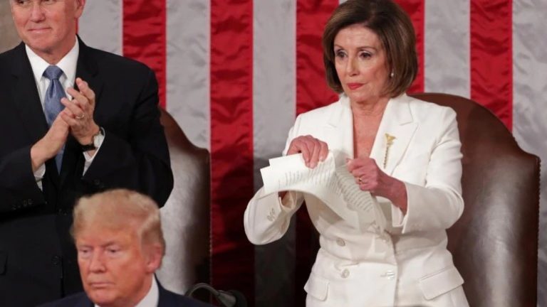 सम्बोधन गर्न मञ्चमा जानुअघि न्यान्सी पेलोसीले मिलाउन अघि सारेकी हात राष्ट्रपति ट्रम्पले देखेको नदेखेझैँ गरेर बेवास्ता गरिदिएका थिए। राष्ट्रपतिले उनको सम्बोधन अन्त्य गर्दै गर्दा पेलोसीले राष्ट्रपतिको सम्बोधनको प्रतिलिपिलाई च्यातेकी थिइन् र त्यो दृश्य देख्नेहरू स्तब्ध भएका थिए। तर, उनले एकभन्दा बढी पटक आफ्नो आसनबाट उठेर राष्ट्रपतिका लागि ताली भने बजाएकी थिइन्।
