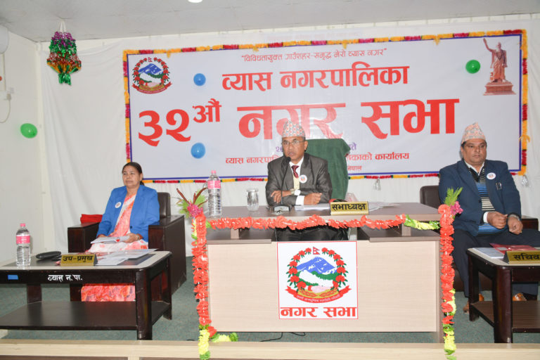 व्यास नगरपालिकाका प्रमुख बैकुण्ठ न्यौपानेले सभामा चालु आवको यस अवधिमा कृषि, पर्यटन, शिक्षा, स्वास्थ्य, उद्योग, अव्यवस्थित बसोबास र भूमि व्यवस्थापन, वन, वातावरण तथा विपद् व्यवस्थापनलगायका क्षेत्रमा काम गरेको बताए । नगरपालिकाको सङ्गठन तथा व्यवस्थापन सर्भे गर्ने काम सम्पन्न भएको उनले जानकारी दिए ।