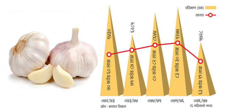 काठमाडौं, २८ माघ । चालु आर्थिक वर्षको ६ महिनामा हामीले ६३ करोड ९१ लाख ६० हजार रुपैयाँको ५ हजार ७ सय २८ मेट्रिक टन लसुन विदेशबाट ल्याएछौं। यही गति रहे वर्षभरिमा एक अर्ब रुपैयाँभन्दा बढीको लसुन आयात गर्नेछौं।